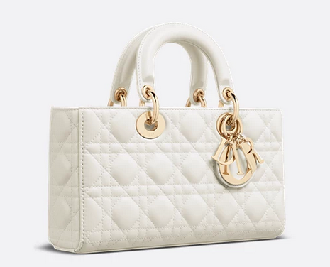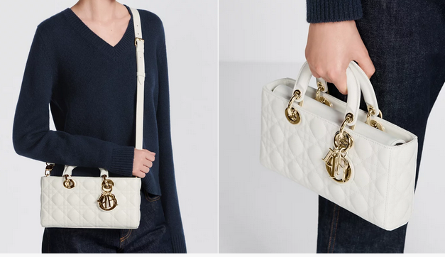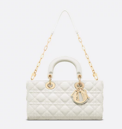 The Lady D-Joy bag epitomizes Dior's vision of elegance and beauty. Refined and sleek, the timeless style showcases the iconic streamlined aesthetic of the Lady Dior line. Crafted in latte lambskin with Cannage stitching, it is enhanced by pale gold-finish metal D.I.O.R. charms embellishing its silhouette. Featuring one removable chain strap and another adjustable and removable leather strap, the medium Lady D-Joy bag can be carried by hand, worn over the shoulder or crossbody as a daily companion. Main composition: lambskin Goatskin and lambskin lining Removable chain strap Adjustable and removable leather shoulder strap Interior slip pocket Dust bag included Made in Italy Dimensions: 26 x 13.5 x 5 cm / 10.5 x 5.5 x 2 inches (Length x Height x Width) The size is suitable for a phone, a card holder, sunglasses and lipstick Strap length: 110 – 120 cm / 43.5 – 47 inches Drop length: 52 – 57 cm / 20.5 – 22.5 inches Chain length: 55 cm / 21.5 inches Chain drop length: 24.5 cm / 9.5 inches Top handle length: 24 cm / 9.5 inches Top handle drop length: 6.5 cm / 2.5 inches Weight: 800 g / 28 ounces Size and weight details may vary depending on the product's material