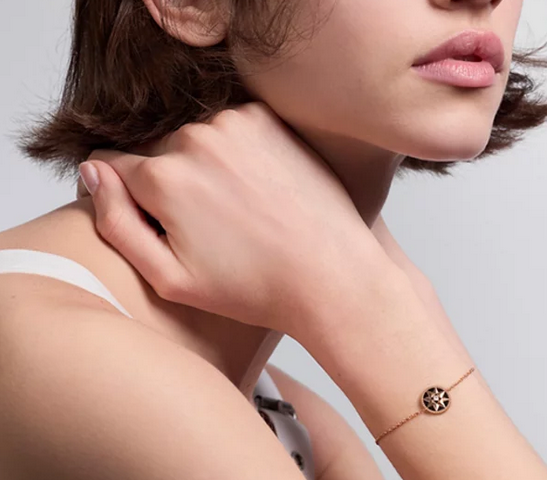Victoire de Castellane reinterprets Mr. Dior's lucky star in the form of a wind rose, an eight-pointed star design. A ring of beading encircles the motif, which turns to switch between the gemstone or wind rose sides. 18K pink gold Diamond (0.04 ct*) Onyx Motif diameter: 12 mm / 0.5 inch *The stone weights are based on average weights only. Length: 17.5 cm / 7 inches with rings to adjust the chain to either 14.5 cm / 5.75 inches or 16 cm / 6.25 inches The adjustment rings on the bracelet allow it to be worn in a shorter or longer version Delivery within 72 hours Low cost island wide delivery In-stock